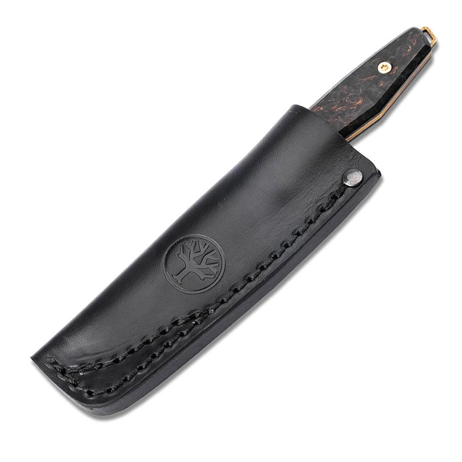 The Böker Daily Knives AK1, created in cooperation with the young knife maker Alex Kremer and Daily Customs, is a versatile small everyday knife that can be perfectly adapted to your own needs. Alex Kremer, born in Fulda in 1993, began making his first knives as an 18-year-old student, and to this day his numerous tours through the seemingly endless expanses of Scandinavia serve as a source of inspiration.In this exclusive version, strictly limited to 50 pieces worldwide, the AK1 is equipped with a gold-colored reverse tanto damascus blade in the “Boomerang” pattern, hand-forged by Chad Nichols. The ergonomically shaped and comfortable handle scales are made from exquisite, dark burl birch wood, whose unique structure forms a harmonious harmony with the blade. In addition, the elaborately manufactured lanyard loop at the end of the handle can be turned around when the handle shells are removed so that it disappears into the handle.Supplied with a high-quality leather sheath, which has a sewn-in Ulticlip and can be easily attached to the hem of the bag thanks to the locking spring clip. This means the AK1 can be drawn effortlessly, while the sheath is reliably held in place by the Ulticlip. Handcrafted in the Böker knife factory in Solingen, Germany.