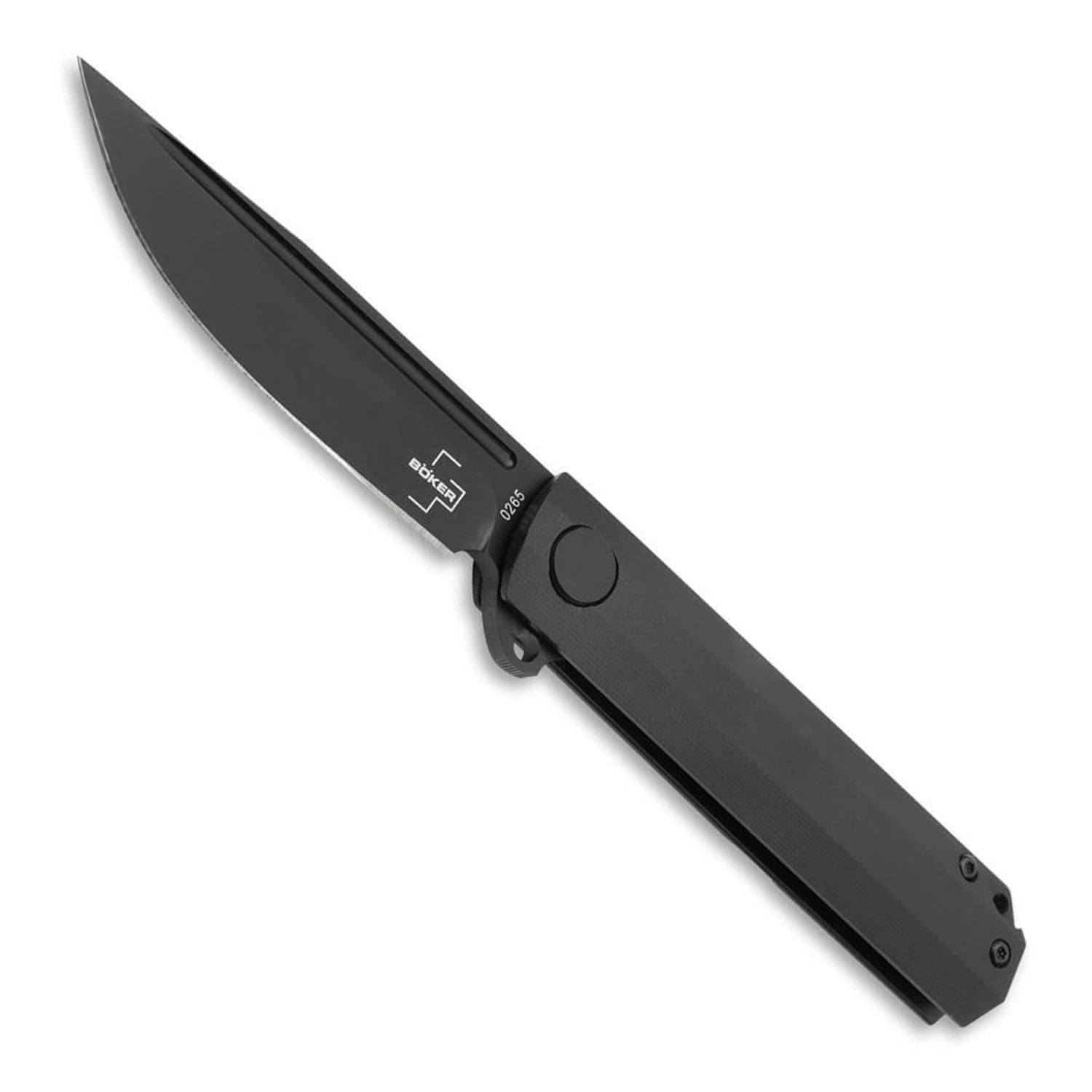 The Boker Plus Cataclyst excels as a combination of a modern EDC and a high-quality gentleman's knife also in the All Black variant all along the line. The sturdy blade made of black-coated 440C is opened with a ball-bearing flipper and has a flat grind and a groove on both sides.