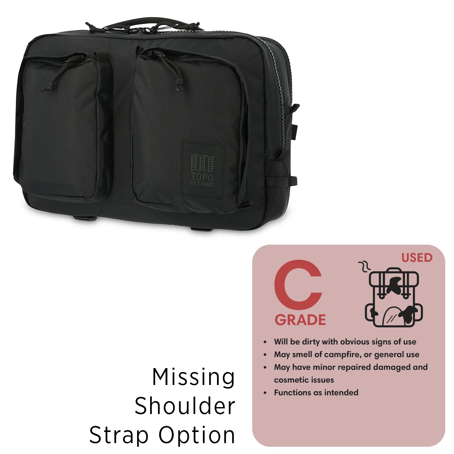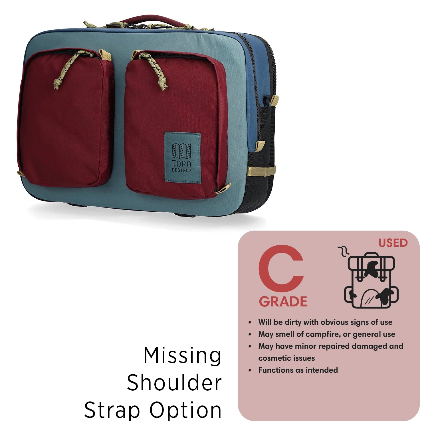 PLEASE NOTE: C Grades are missing the shoulder strap carry option. Backpack and top carry are functional.