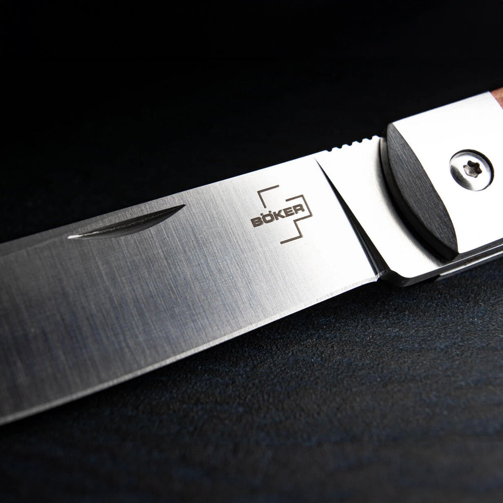 The full-sized Boker Plus Bonfire combines a classic pocket knife design with high-quality materials and perfect workmanship. The traditional look is further accentuated by the neatly fitted handle scales made of warm Bubinga wood or green micarta, and short stainless steel bolsters. The impressive D2 blade is finished with a fine satin finish and opens on ball bearings via nail nick or front flipper. A sturdy linerlock takes over the locking. With practical deep-carry clip (tip-up/r). Supplied in a high-quality nylon case for storage.