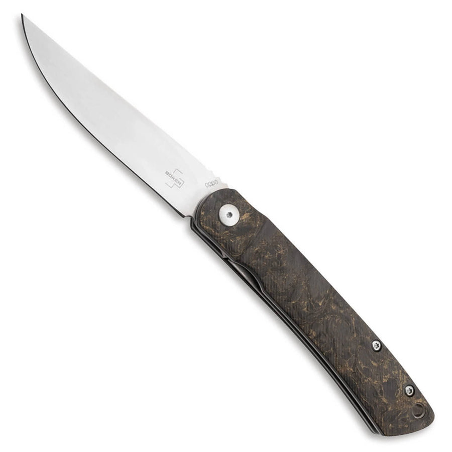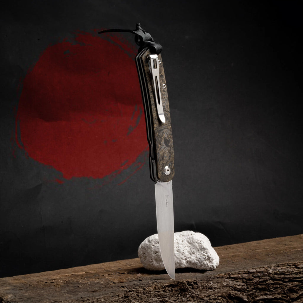 Sincerity, courage and kindness are among the traditional basic virtues that still enjoy a high status in Japanese society today. Knifemaker Kansei Matsuno incorporates these values into the Boker Plus LFL07 and creates a noble gentleman's knife full of grace and style.Equipped with a hollow-ground blade made of powder-metallurgical CPM-S35VN with a hairline finish, the pocket-knife takes on any cutting task in a sublime manner. The discreet front flipper opens the blade with precision and smoothness. The eye-catcher and visual highlight of the Boker Plus LFL07 is the greyish-brown handle made of FatCarbon composite carbon fiber, which is interspersed with gold-coloured shades and consistently continues the slim line of the folding knife. The stainless steel linerlock works reliably and harmoniously rounds off the overall appearance of the collector's knife, which is limited to 500 pieces. The deep-carry clip made of satin-finished stainless steel allows for tip-up (r) carry and is functionally supported by the lanyard hole.