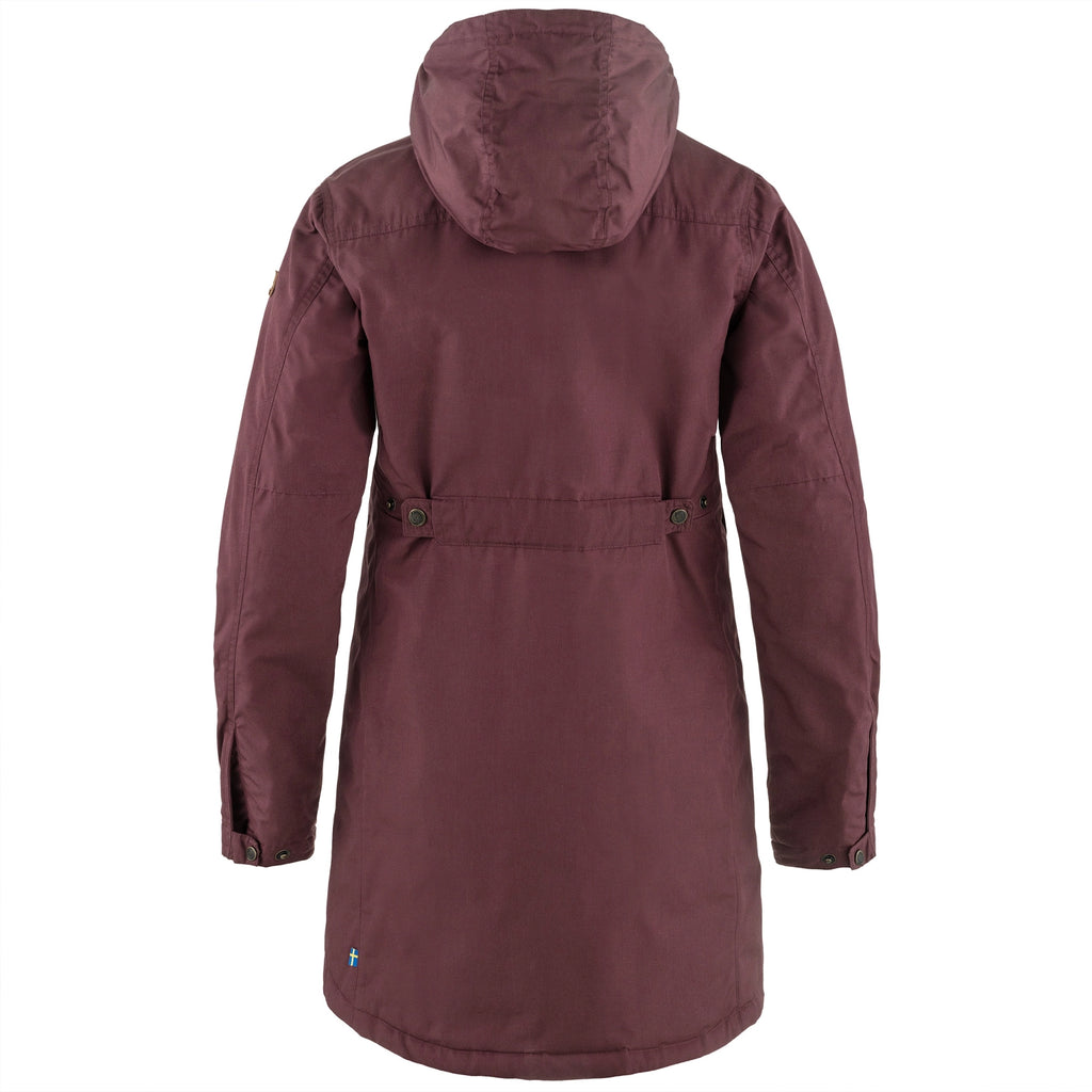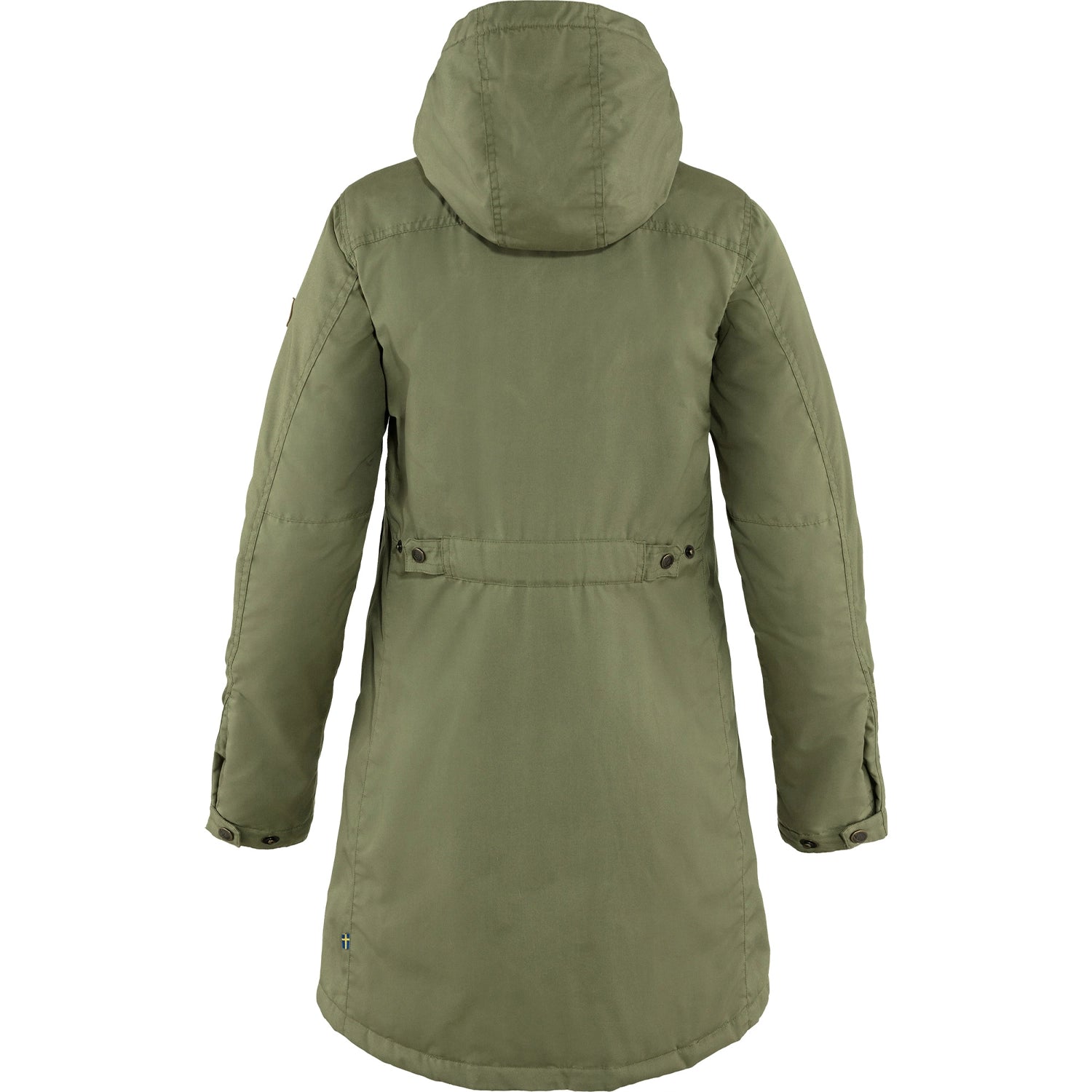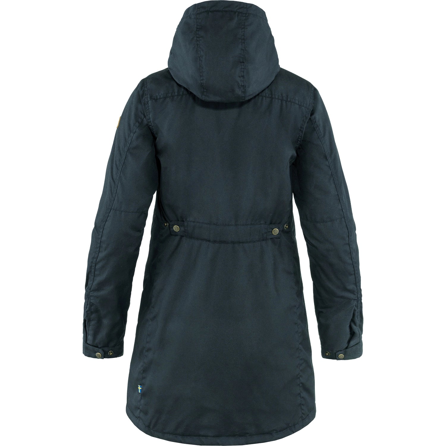 Long, lightly padded everyday parka with fixed, adjustable hood. Made from durable G-1000 Original that resists wind and rain, with a recycled polyamide lining. The synthetic padding PrimaLoft® Black Insulation with P.U.R.E. Technology gives extra warmth, even in damp conditions. Perfect as an everyday jacket during the colder months of the year, and the hardwearing outer fabric makes it suitable for forest walks as well. The model is long for warmth over the rear and thighs and the front zipper is two-way, with a protective flap on both the inside and outside to stop cold winds. There is a chest pocket and two hand pockets, all with zippers. The waist can be adjusted with buttons at the back. Adjustments with press buttons at sleeve cuffs. The jacket can be further protected with Greenland Wax (not included) for added resistance against wind and rain.