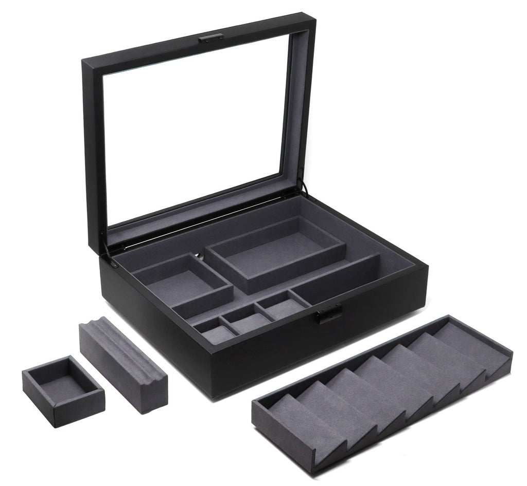 There are watch boxes, pen cases, knife displays, and dump trays, but what about a chest that combines the best aspects of all of them? Enter the Kaviso Cache: a sophisticated home for everything in your EDC rotation—from knives, watches, flashlights, and pens, to your phone, wallet, cash, and keys. We’ve made some improvements since we launched the original Cache. Among them are newly powder-coated hardware for a sleek look, a single shelf compartment (instead of a two-piece construction) for better stability, and a lock and key to keep the top secure. Made with a handsome, black faux leather exterior and a soft microfiber lining, the Kaviso Cache will fit in well on your nightstand, dresser, or coffee table. Need more space? Add a matching storage drawer (or two) that fits flush beneath the Cache.