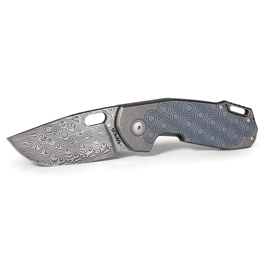 Framelock folding knife. Damask blade Rose pattern. Titanium frame lock with steel insert and tritanium handle with CNC circular designnd stonewashed blue finish. Stone washed blue titanium spacer and CNC machined monobloc titanium clip. Limited and numbered edition. Wood and plaxiglass display.