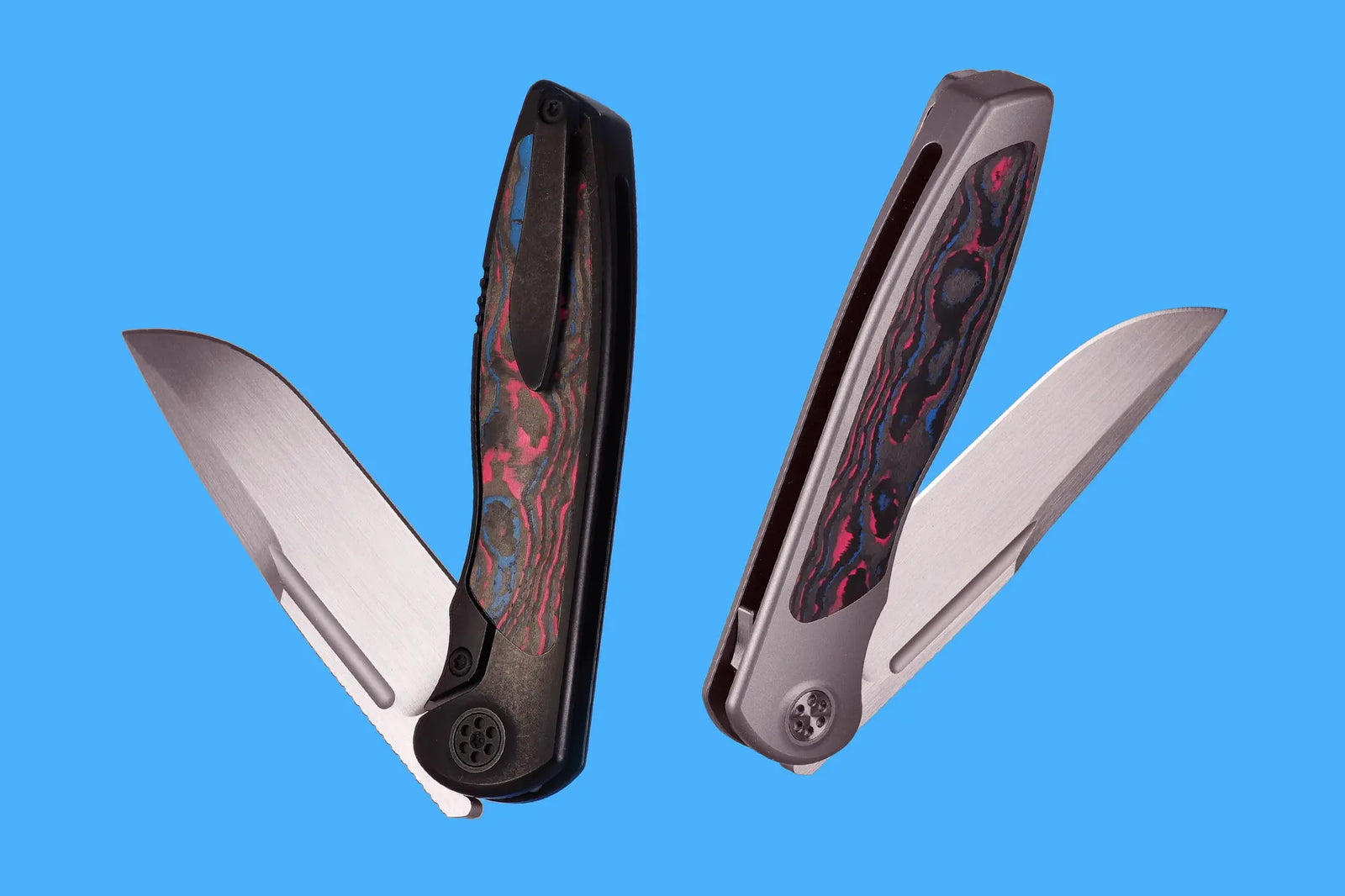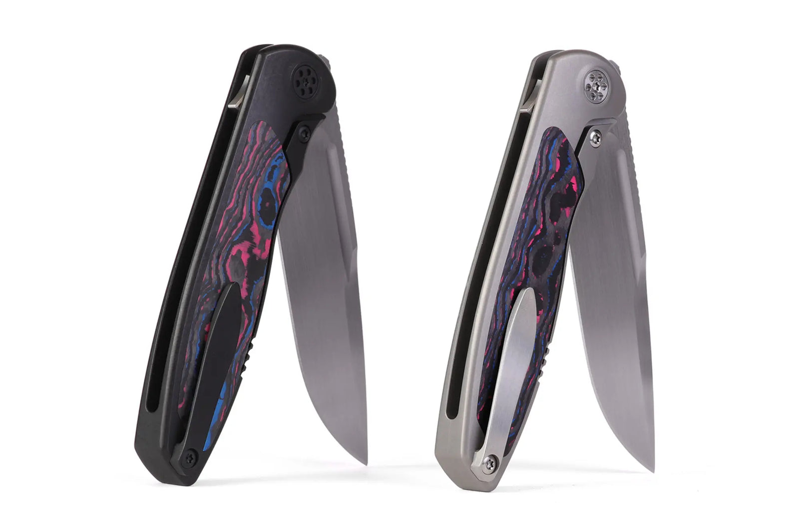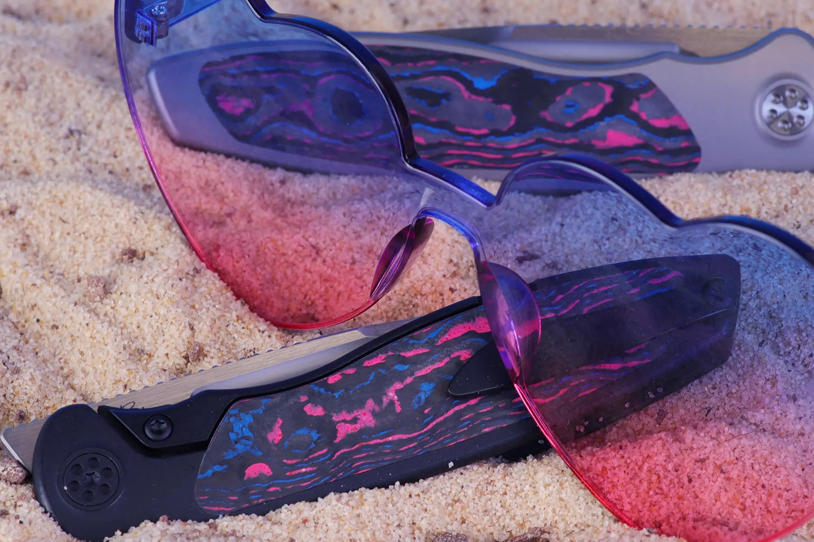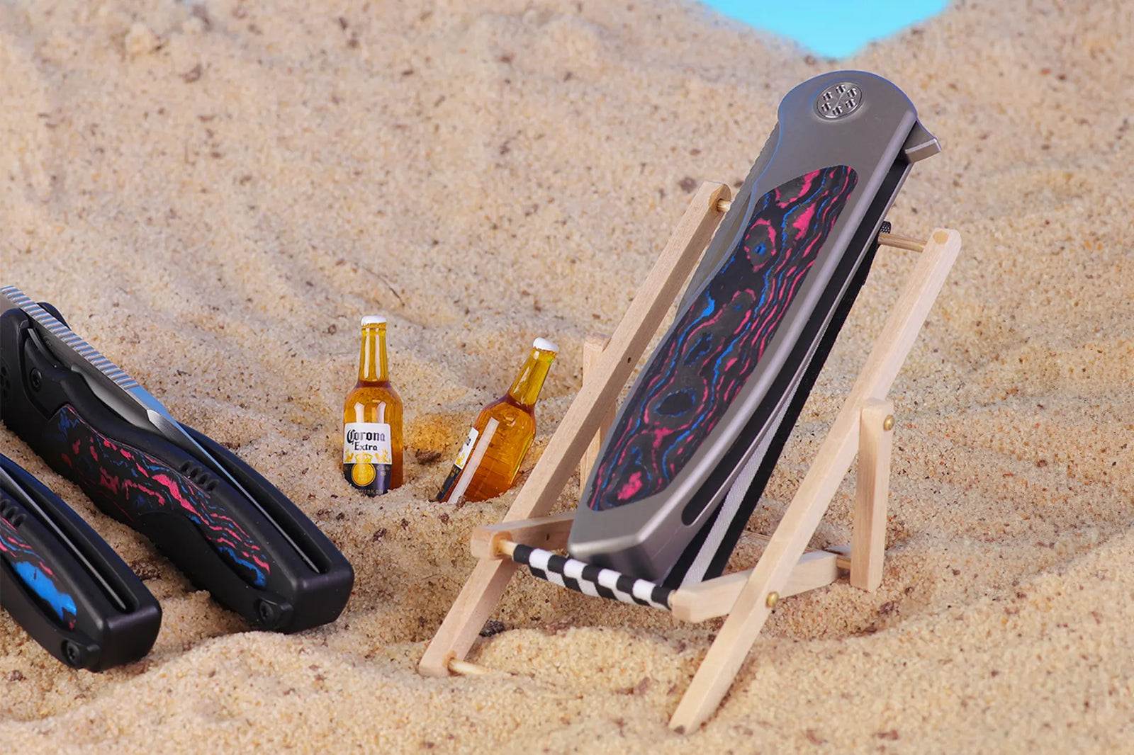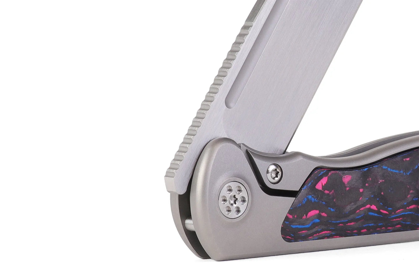 Flashy and fashionable pastel colors adorn the newest Sharp by Designs Mini Tempest. An EDC fit for Sonny and Rico, the blacked out titanium handles provide an undercover stealth look to compliment the Art Deco Miami Vice carbon fiber. Keep this top shelf folder secure and at the