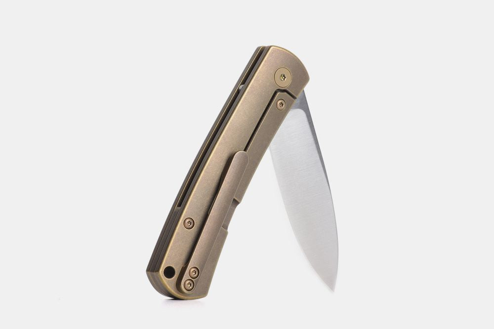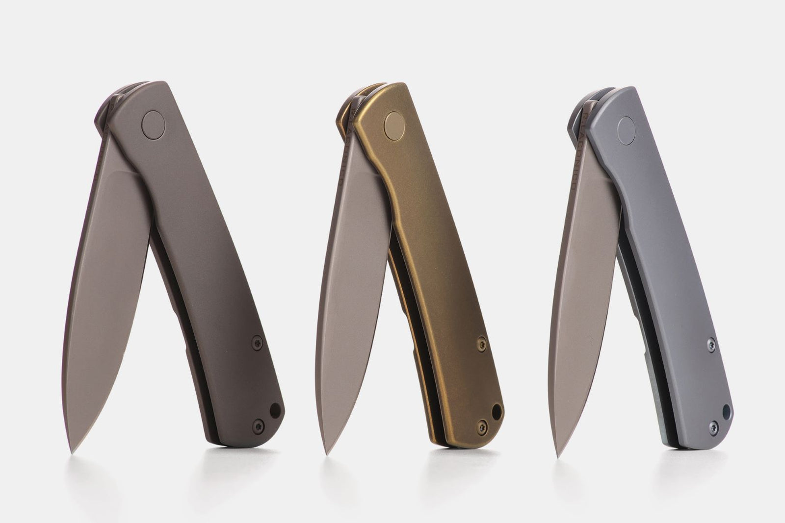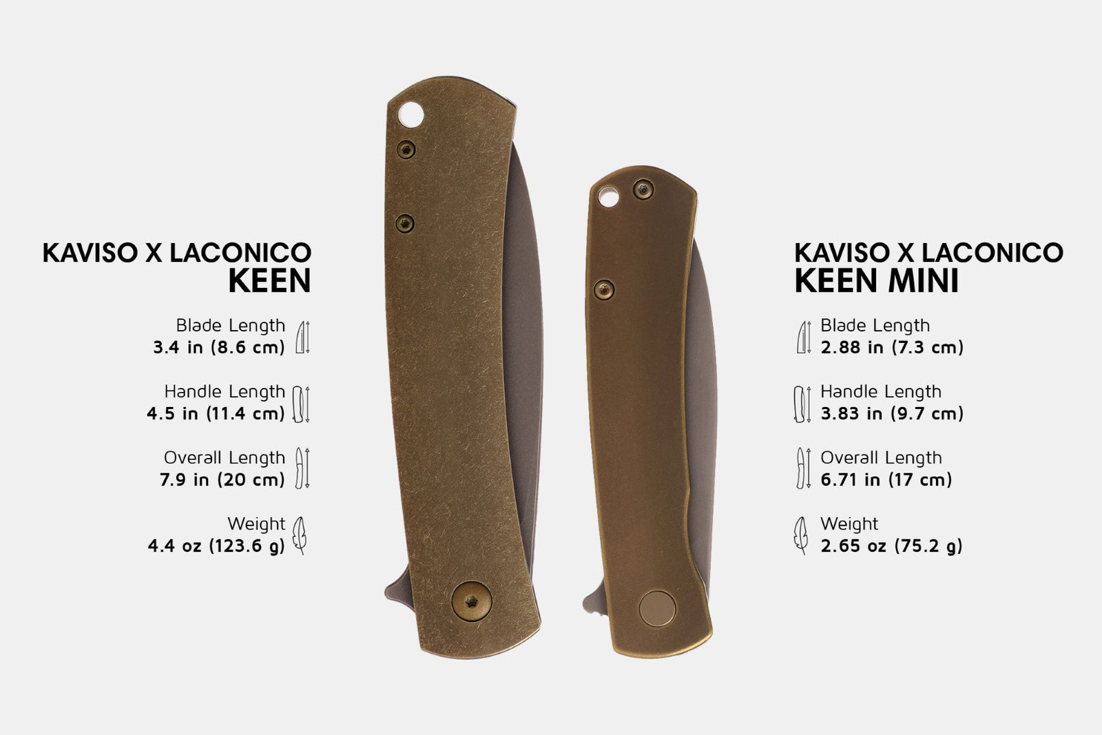The final specs of our Kaviso x Keen Mini Frame Lock lineup are born entirely from our community polls on the Drawing Board. Based on your feedback, we landed on CPM-S35VN blade steel offered in both Satin and Stonewash finishes along with anodized blue, stonewashed bronze, and gray bead blasted titanium handles. Hardware is color and finish matched titanium, including an extremely minimalist show side pivot. Signature R. Laconico branding appears on the spine of the blade, and serial numbers for each piece are engraved on the titanium backspacer of the handle.