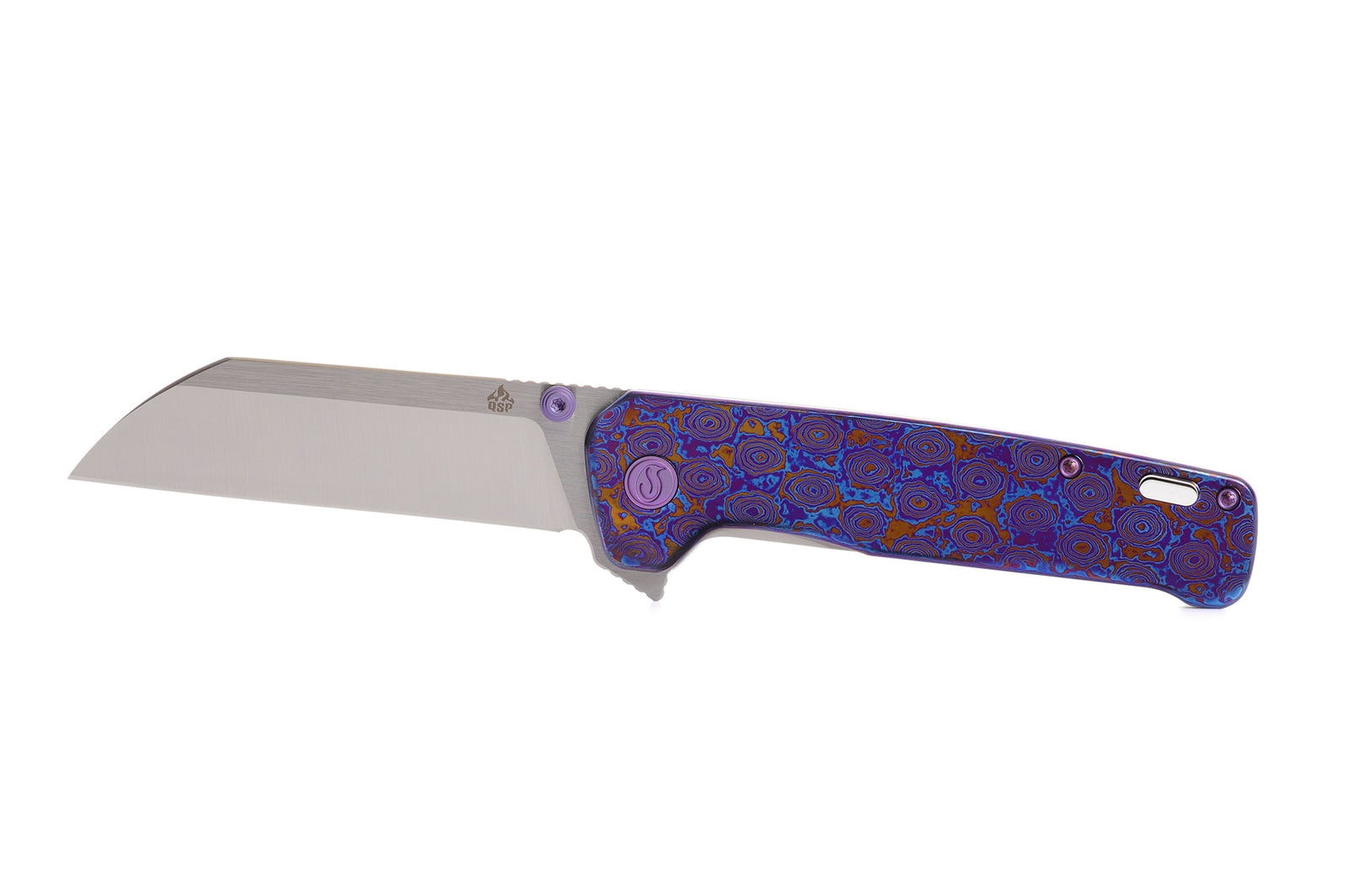 Eye popping purple anodized titanium hardware accents the piece along with the purple titanium penguin pivot found only on knives in the Kaviso x QSP lineup. Crucible CPM-S35VN premium steel blade in your choice of satin or stonewashed finishes deployed via rounded, removable thumbstuds, which are newly featured on this batch of waddlers.