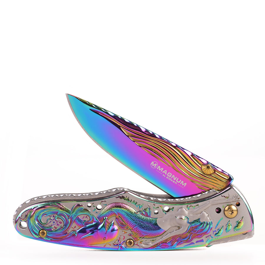 Our Magnum Rainbow Mermaid was a feast for the senses. Now, the Rainbow Yara goes a fantastic step further. The extraordinary pocketknife gets its name from the Mistress of the Water, the most feared siren of Brazilian mythology. It has a deep relief on both sides; the legendary mermaid is decorated with an elaborate two-tone finish on the front handle scale.The blade of stainless 440A steel is spring-loaded and opens with a flipper. It is secured with a sturdy linerlock. The embossed wave pattern on the blade face, the shell-shaped metal inlay and the elaborate filework on the spine and liners show the great attention to detail that went into this design. With a clip (tip-up).