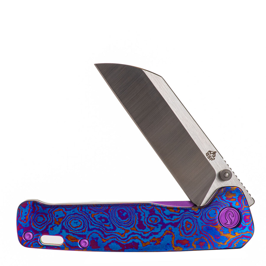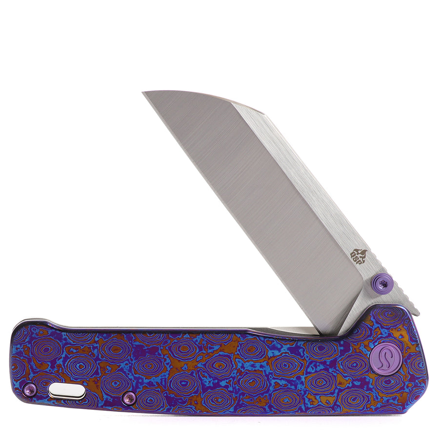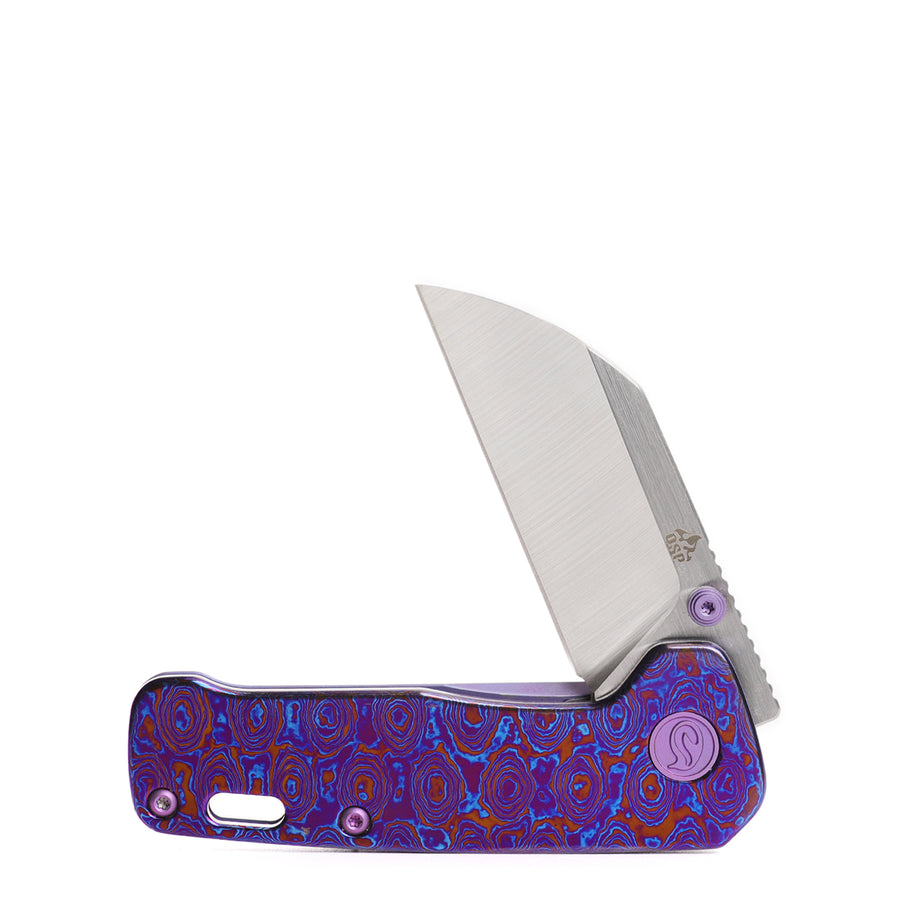Purple Perfection. Following the success of our inaugural release of the Purple Ti Penguin earlier this year, we’ve brought back the fan favorite for this week’s finale. Purple anodized titanium frame lock Penguin with synesthesia scales and matching pocket clip. Mokuti scales, mokuti pocket clip, purple hardware and Penguin Pivot. S35VN blade steel in satin finish with matching thumbstuds.