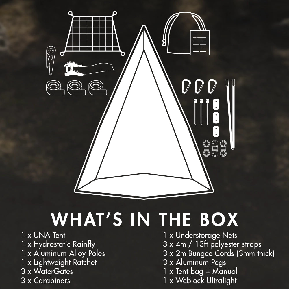 | Components | 1 x UNA 1-Person Hammock Tent (840g/1.9lbs) 1 x 2500HH Rainfly-Forest Green or Grey (500g/1.1lbs) 1 x 8.5mm anodized aluminum pole (120g/0.25lbs) 1 x UNA Storage Net (60g/0.13lbs) 1 x Lightweight ratchet (160g/0.35lbs) 1 x WebLock Ultralight (150g/0.33lbs) 3 x Carabiners (60g/0.13lbs) 3 x 4m/13' black polyester straps (320g/0.7lbs) 3 x WaterGates Small (20g/0.04lbs) 3 x 2m Bungee cord thickness 3mm (60g/0.13lbs) 3 x Aluminium Pegs (60g/0.13lbs) 1 x Tent Bag (60g/0.13lbs) |