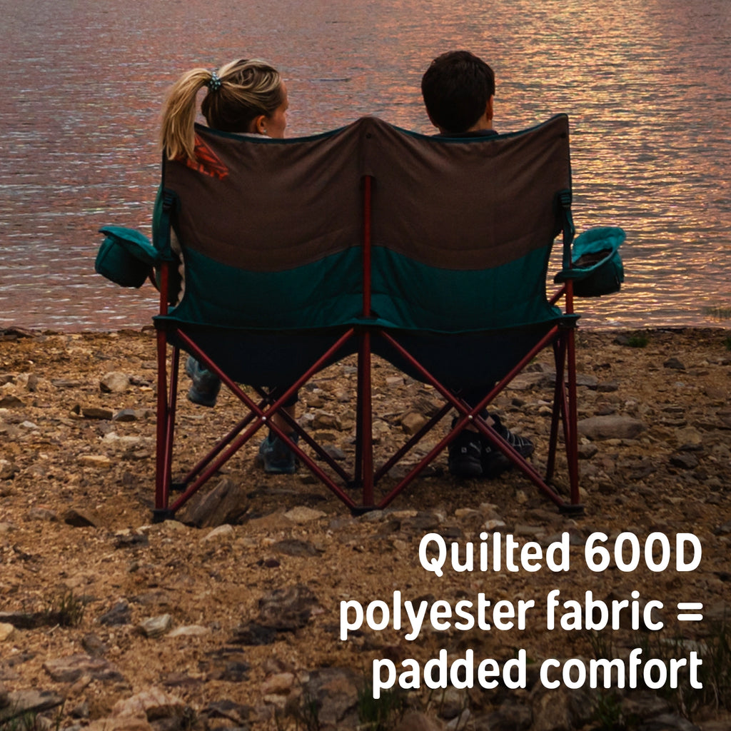 Relaxed, slightly reclining design with room for two (plus the family dog). 42 inches of seating space on Cushioned, insulated, nearly indestructible 600D weight polyester fabric. With quality materials and thoughtful Kelty, craftsmanship will keep your buns and back warm on cool nights for years to come. Steel-framed construction, puppy-proof fabric, and a weight capacity of 400 lbs.