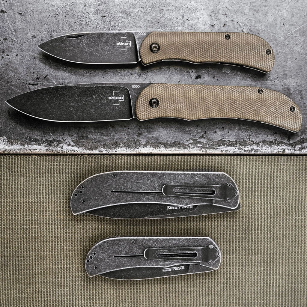 Hardly any other Boker Plus pocket knife has been in such demand in recent years and appeared in so many variations as the Exskelibur by Mike Skellern. With his design, the knifemaker from South Africa has established one of the most successful and popular series in the Boker Plus range.This particularly modern variant with a stainless steel frame lock is once again significantly slimmer than the various liner lock versions and is convincing both in everyday use and in tougher applications.The textured front scales are made of olive green micarta and give the design, originally intended as a gentleman's knife, a rustic look. The Spear point blade made of D2 has a dark stonewash finish and thus further emphasizes the outdoor character of the pocket knife. It is opened two-handed or by front flipper and reliably locked by the sturdy stonewash frame lock. Supplied with a convertible clip (tip-up/tip-down) and a high-quality nylon case for storage.