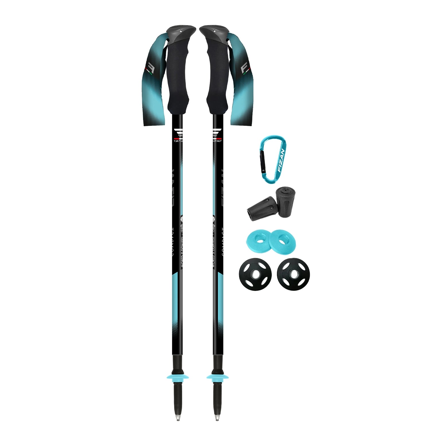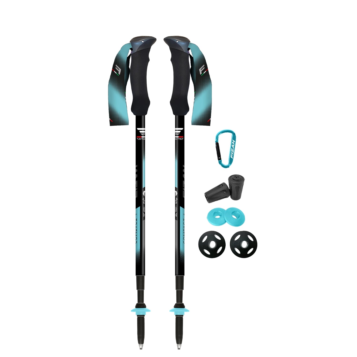 Fizan Compact 4 Trekking Poles with Blue graphics and handles, aluminum, twist lock poles, 6 oz each, lightweight, made in Italy