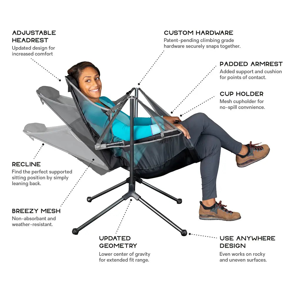 The next generation in camp comfort, Stargaze has been re-engineered for even more comfort and stability, with a lower center of gravity and extended fit range. This first-ever swinging and reclining camp chair takes relaxation to a new level. The swinging offers an exciting new sitting experience, with a relaxing motion that is designed for comfort. And when you’re ready to recline, simply lean back to activate the auto-reclining mechanism and enjoy a great view of the stars.