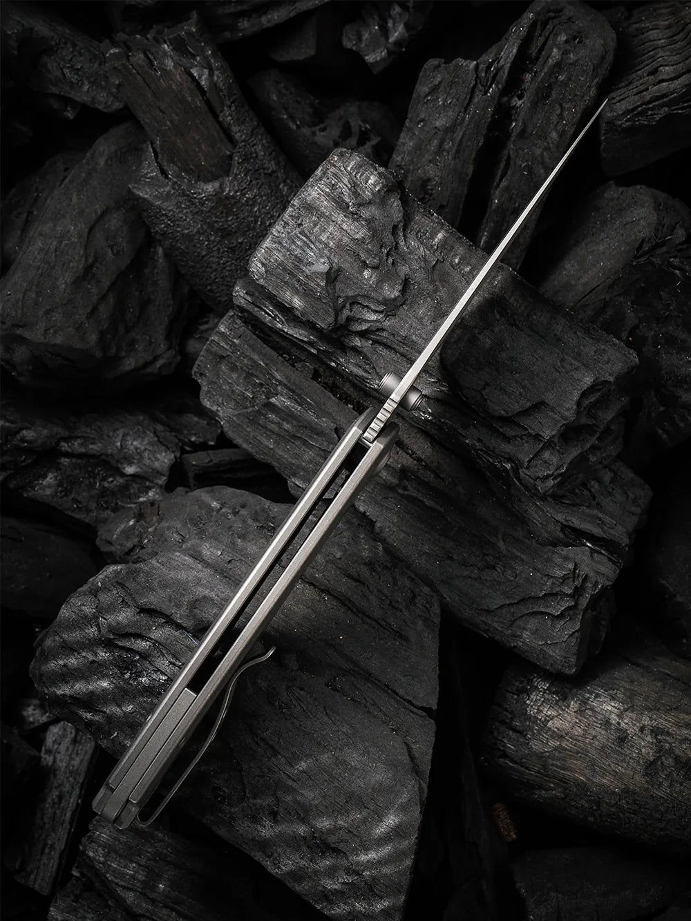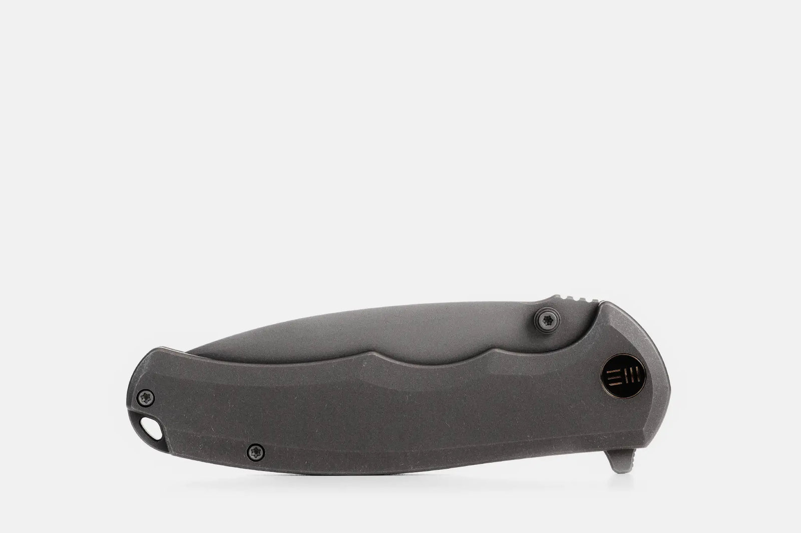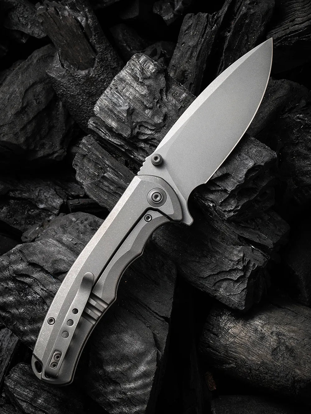 Carrying a blade of this size in your pocket grants you a reliable cutting tool, but what truly stands out is the remarkable lightness of this compact folder. Weighing a mere 3.83 ounces, despite its impressive 3.75-inch blade, the Praxis showcases its mastery in stealth. The premium Praxis is sporting stonewashed 6AL4V titanium handles, titanium clips and screws, and caged ceramic ball bearings for smooth snappy action. Adding to its refreshed appearance, the pivot proudly displays the distinguished branding of WE Knife Co., accentuated by the blacked-out Titanium finish.